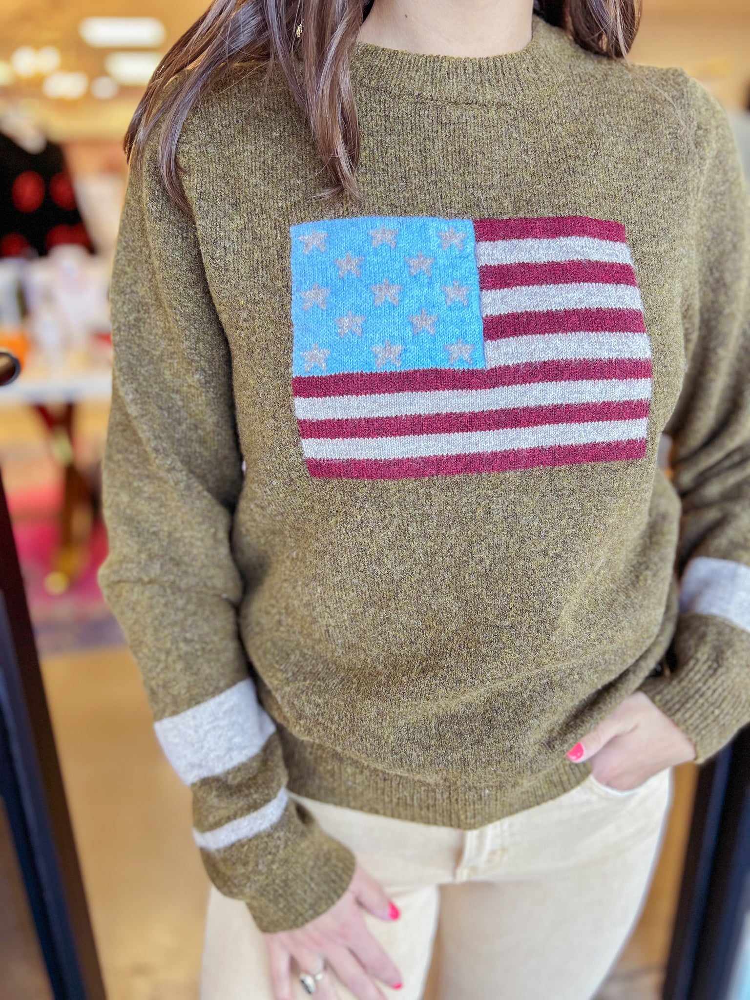 Haleigh’s wearing a small! Knit flag detailed sweater - 45% polyester, 45% acrylic, 7% wool, 3% spandex