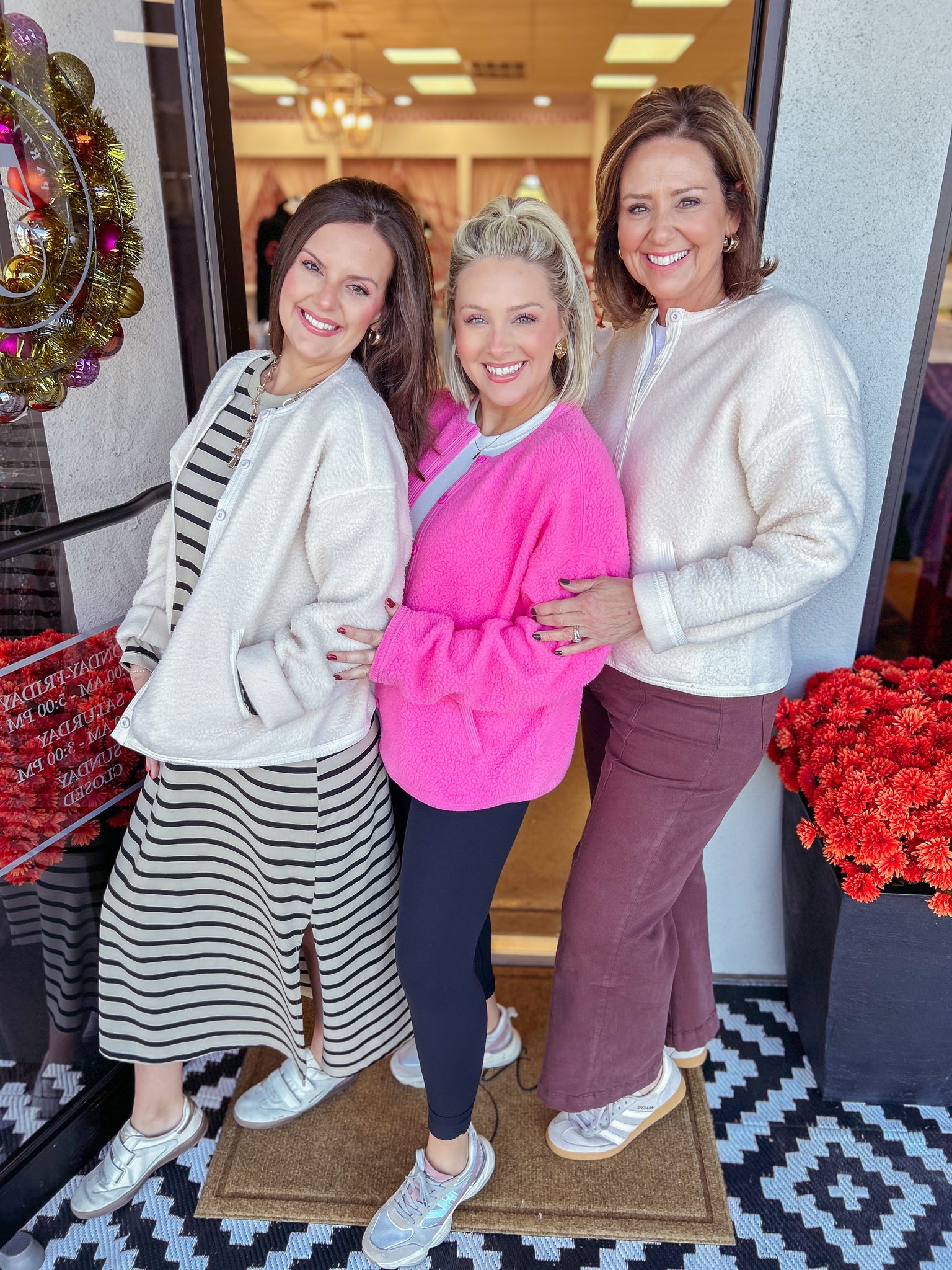 Haleigh is wearing a small & Kelly is wearing a medium! Runs forgiving! 100% polyester